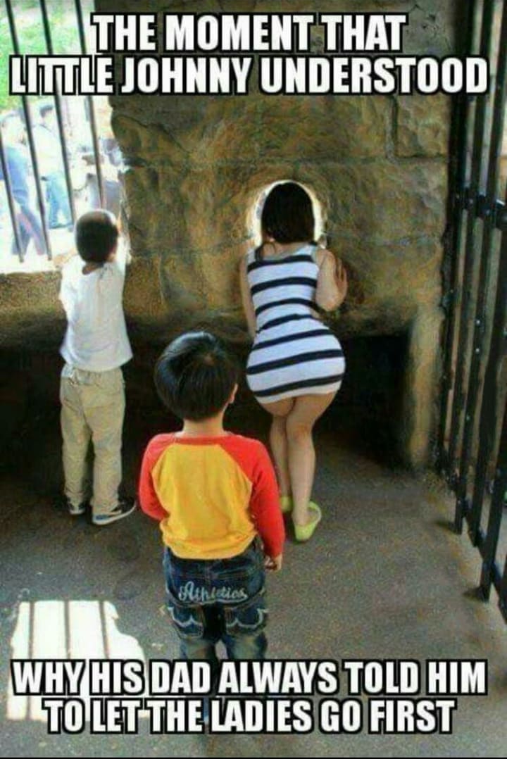 Apparently, there's no such thing as too young when it comes to fatherly advice and appreciation for the female form. When daddy tells you to let the pretty young lady go first at the zoo so she can see the animals, you listen. Not only for your eyes, but so daddy can snap a creepy picture for some funny memes, too.