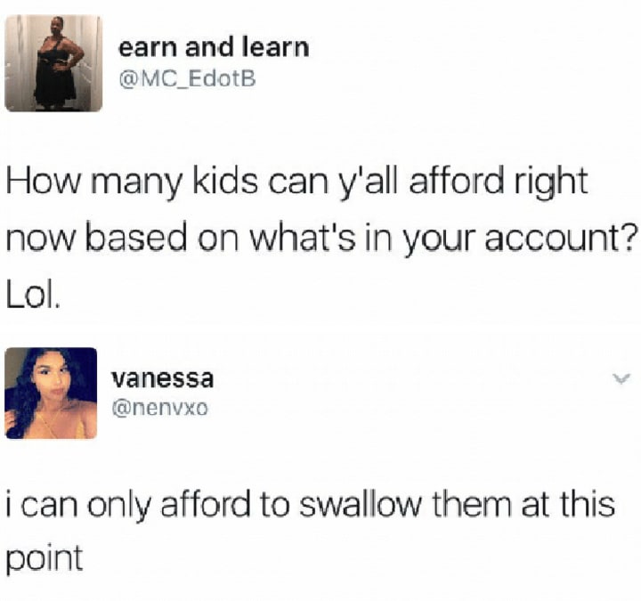 You should never turn down free advice, especially when it's on point like this here is. If you are trying to decide how many kids you should have, try using this efficient yet complicated formula. If you look at your bank account and notice you are broke, well then... don't have children yet. Instead, just try swallowing. Funny memes save the day again!