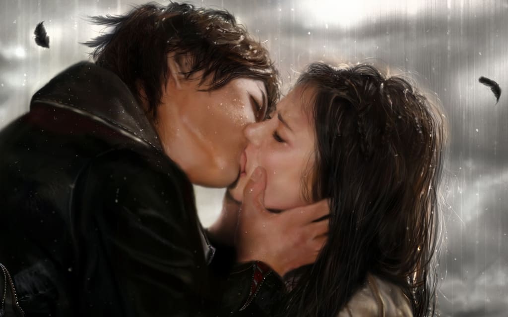 His jacket is wet but she seems not to care as his arm around her waist pulls her to him, she feels warm against him as their lips meet, not tenderly, not carefully, but with the ferocity that he has been feeling for weeks.