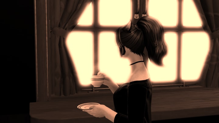 Sitting quietly in the evening light at the counter, I sip away at the freshly brewed tea, listening to all the commotion next door to take in the sounds of the movers cursing at all the furniture. My gaze turns to the window sat atop the counter, the only real view is the hedges and the top part of the neighbors house, nothing much to actually see. Standing up, I take my tea and head back upstairs to my room to sit at my window table to watch the entertainment of them struggling next door. The room still dim only lit by the evening light pouring in, I move to the curtains pulling them to the sides and sitting at my table, peering out the window to see three movers struggling with moving a sofa across the yard to the house.