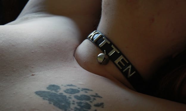 Truth be told, she had always wanted a master, wanted to be dominated. Collaring her, even if it was with a ribbon, felt like a natural extension of her desires. Kitten lathered her body with soap, she was quite curvy, and her skin was soft and delicate. She had her eyes closed and a hand between her legs when she heard Sir enter the room.