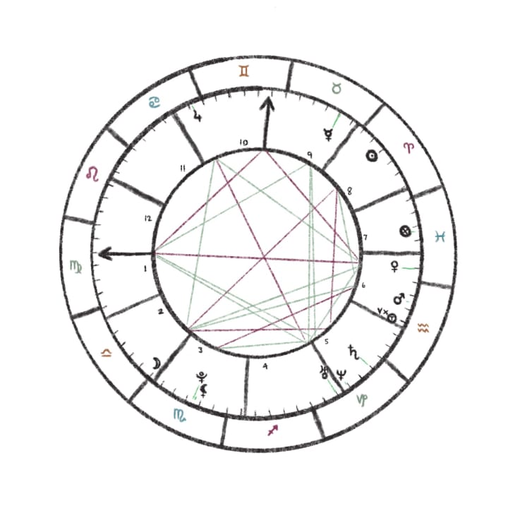 A deepening interest in discovering my cosmic makeup led me to explore the hot mess that is one’s birth chart (see Figure 1). A birth chart is a map of sorts which shows the placement of the planets in relation to the zodiac constellations, based on the exact time and location of your birth. It can be a tad overwhelming when you first input your details and see the chaotic crossing of lines and curious symbols scattered about in a seemingly meaningless fashion and, truthfully, I still get confused when I look at mine. Thankfully, there are a number of websites which do the legwork of decoding your chart, providing a thorough explanation of all it entails. The main takeaway from mine was that, despite being a born under a fire sign, I’m primarily governed by the energies of earth and water, with a total of 70% of my chart composed of these elements.