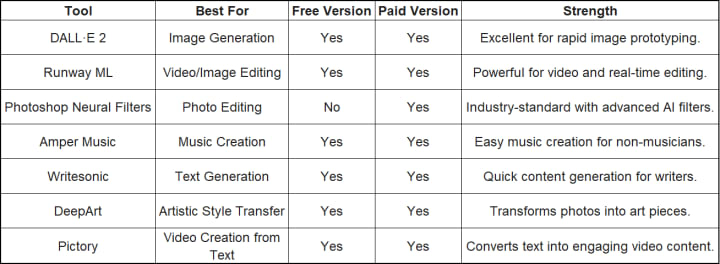 For image creation, DALL·E 2 and Runway ML are top choices. For video editing, Runway ML and Pictory are great. Amper Music is ideal for background music. Writers will love Writesonic for content generation.