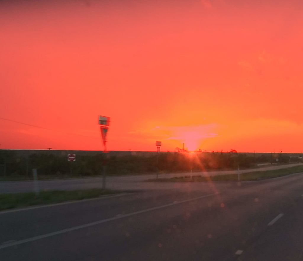 No clouds in the sky since I left Laredo. Daytime has been hot, in the mid-nineties. That’s nothing new this time of year but overnight it’s cold. In the forties. Maybe colder. It’s never that cold here in July. Something has affected the atmosphere. Daylight is different. Instead of bright white, there’s a reddish tinge to it. At the horizon it’s a hazy, washed-out maroon and faint pink in the immediate corona around the sun. Maybe it’s my eyes.