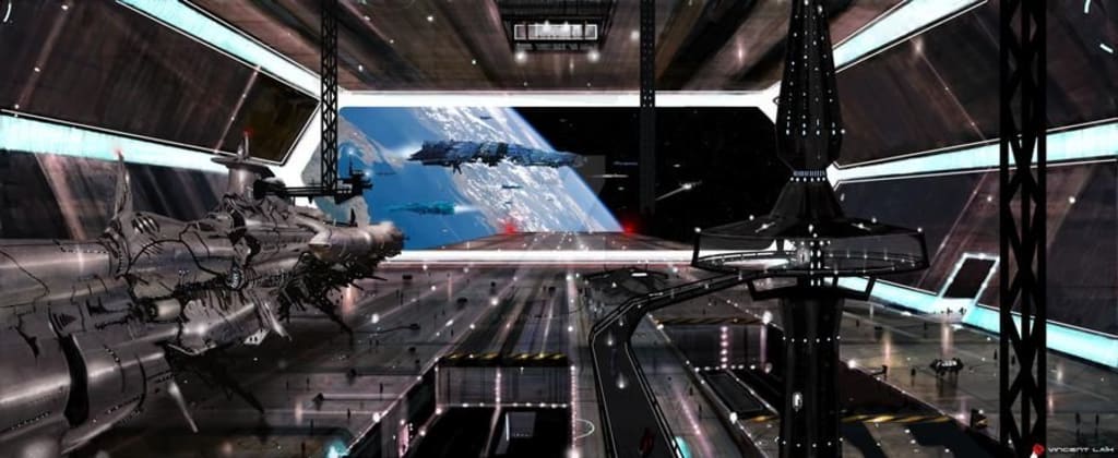 I hit the front computer's buttons and squeeze the dual joysticks with sweaty palms and lick my dry lips. A moment pass, to feel my heart pound away the seconds, the silver metal wall bracks open. A dark carpet of gleaming reds, oranges, and blues dazzling my eyes. The orbital space dock rotated, all the stars were at once eclipse by a massive turquoise sphere.