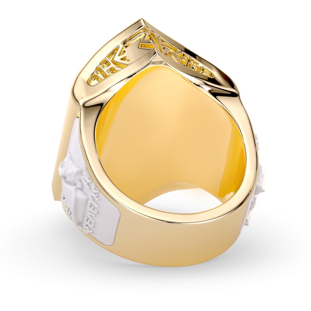 Khan’s Dominion reflects the vastness and endurance of the Mongol Empire. The ring features a sculpted horseman in 18k yellow gold, paired with either Siberian nephrite jade or kiln-fired guilloché enamel. The jade, sourced from a region historically associated with Mongol culture, represents resilience and strength. Shield-like borders inspired by Mongolian armour give the piece a bold, architectural presence.