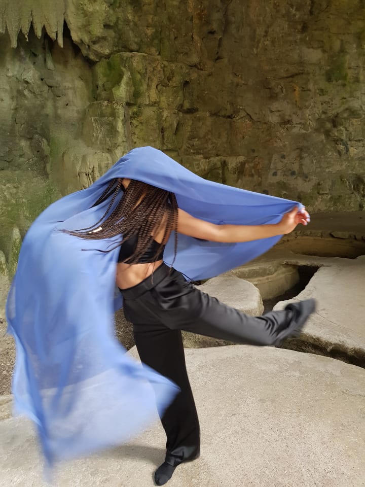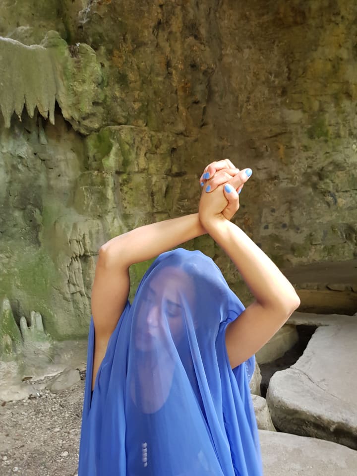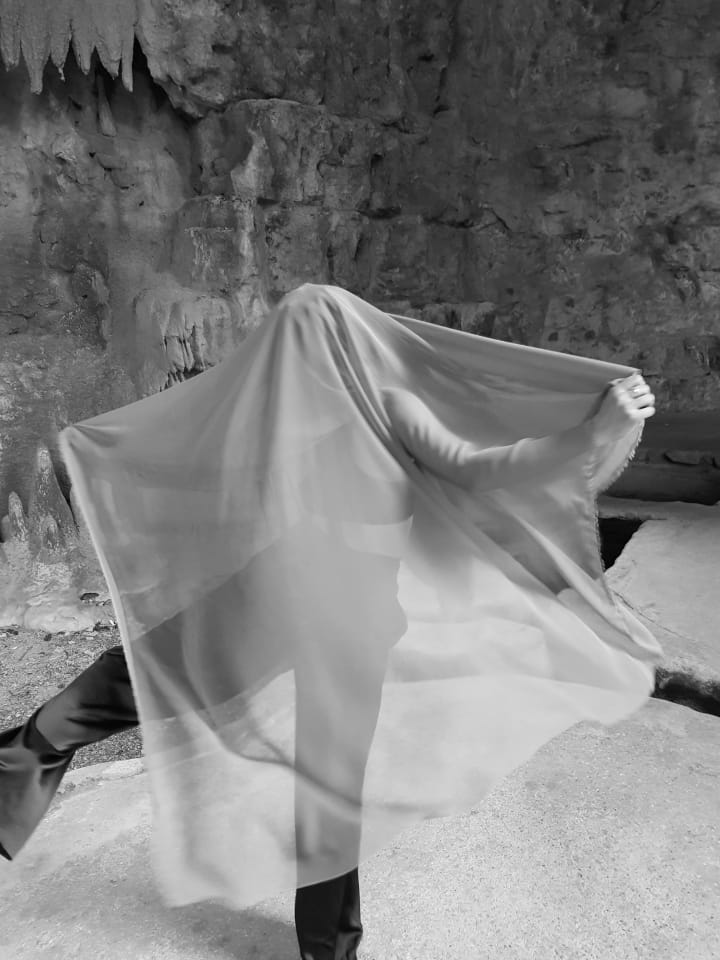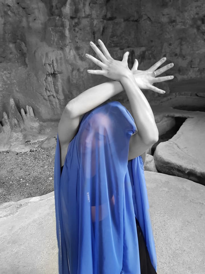 Perhaps this veil symbolizes our Mother Earth that escapes us, this Earth that we so much want to dominate and abuse. Our beautiful, colorful Home is represented by this blue veil who changes into differents tones indefinitely until he dies and remains shadeless on the floor with Humankind leaving without nothing left to dominate.