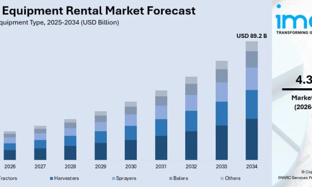 Rising agricultural mechanization, improved access to advanced technology without heavy investment, increased demand for flexible farming solutions, rapid urbanization, rising sustainability concerns, the growing trend of precision agriculture, and increasing government support for mechanized farming are driving demand in the farm equipment rental market. According to IMARC Group's latest data, the global farm equipment rental market size was valued at USD 60.7 Billion in 2025. Looking forward, IMARC Group estimates the market to reach USD 89.2 Billion by 2034, exhibiting a CAGR of 4.37% from 2026-2034.