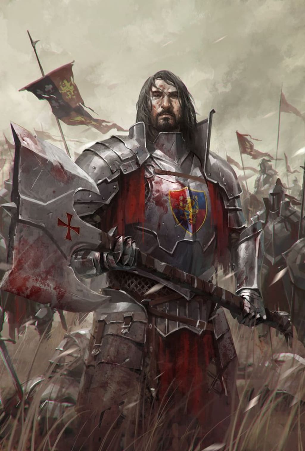 The two gallant warriors step onto the battle field. One clad in red plate mail, the other in rags. The man in red draws his mace, his opponent wields a battle axe.