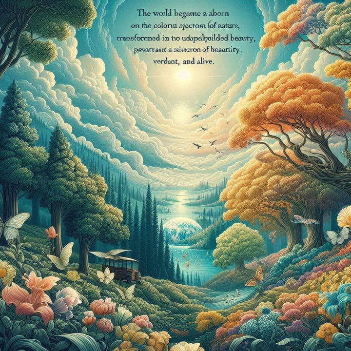 The world again became a reborn utopia on the colorful spectrum of nature, transformed into a masterpiece of unparalleled beauty---verdant, vibrant, and alive.