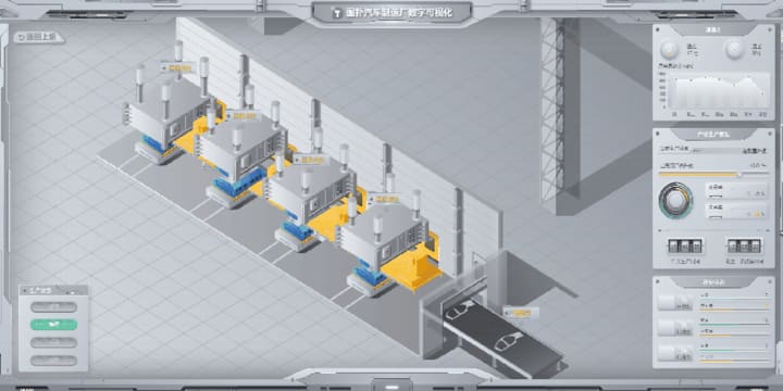 The system links 2D and 2.5D UI elements with server data. When the user clicks on equipment on the page, a new page pops up, displaying the equipment’s detailed internal structure. This provides a more accurate view of the internal operation process. Raw materials are extracted from their storage area and transported to the stamping workshop via a robotic arm. After being stamped, some molds are delivered to the welding workshop by vehicles, while others are temporarily stored in the mold storage area for future use.