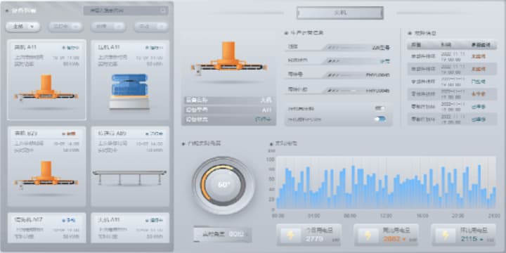 By using Hightopo’s 2D chart components and data binding, the production data and energy consumption of the production line can be obtained and displayed in real time. The system can also make an overall display of the planned output and target output, as well as the operation of the robotic arm. Animated effects can make the entire page look more concise and beautiful, providing a high-quality user experience.