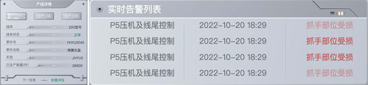 The real-time alarm information is displayed in a table format at the lower left corner of the page. This includes the name, time, and location of each device that is in alarm. The production situation can be combined with different production lines to carry out data visualization statistics according to the line body model, line body state, part number, part name, model, and production quantity of the production line.