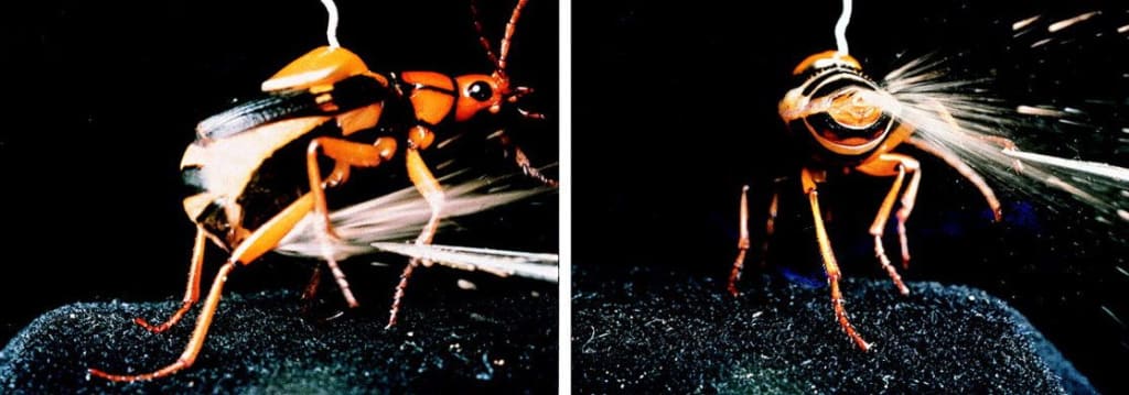 The resulting chemical reaction is incredibly exothermic (heat-producing). The mixture instantly heats up to around 100°C (212°F) — the boiling point of water — and is expelled from the body as a hot, noxious gas and liquid spray. This is not just warm mist — it’s a mini chemical explosion, often accompanied by a loud pop sound, which can startle or harm predators like frogs, birds, or spiders.