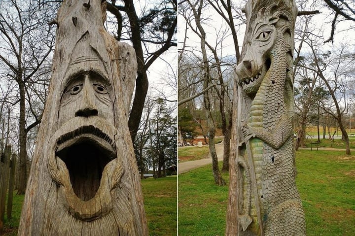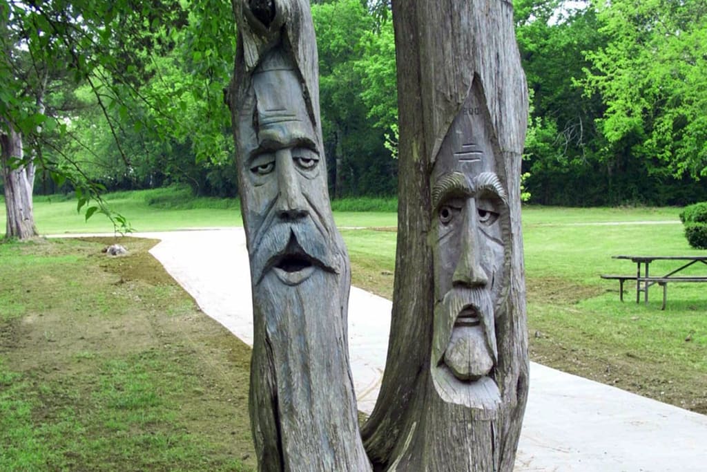 Over thirty carved trees can be found in Orr Park in Montevallo, Alabama, USA, along the park's Shoal Creek walking trail. Tim Tingle, a local artist, carved the trees.