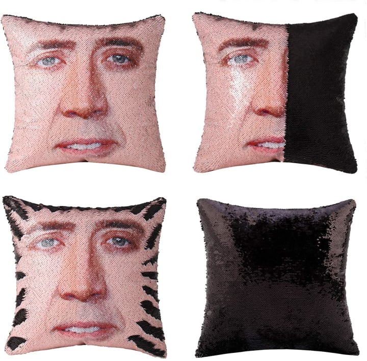 7. Nicolas Cage Reversible Sequin Throw Pillow - Have you ever wanted to have Nicolas Cage’s face sitting on your couch? There’s a product for that. Meet the Merrycolor Throw Sequin Comedy Throw Pillow. Nowhere in the description is Nicolas Cage mentioned and yet, there is no denying that when you turn over the sequins on the pillow, the star of Face Off and Broken Arrow is staring back at you. I’m guessing this is not an officially licensed Nicolas Cage product but, who knows, he’s kind of a weird dude.