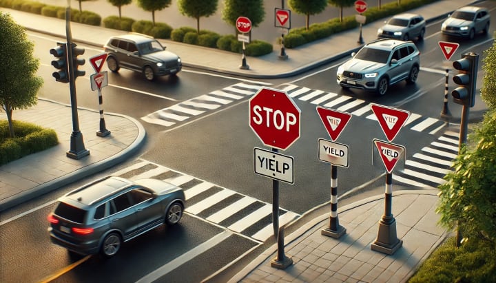 Stop Sign: A red, octagonal sign with the word "STOP" clearly printed in white. At a stop sign, drivers must come to a complete stop and yield to any pedestrians or other vehicles before proceeding. Failing to stop can lead to traffic tickets or, worse, accidents.