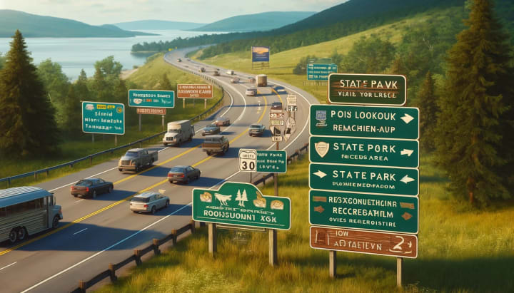 Informational signs are often green or blue and provide helpful details such as directions to nearby towns, distances to certain destinations, and highway exit numbers. These signs are especially important on long road trips or in unfamiliar areas.