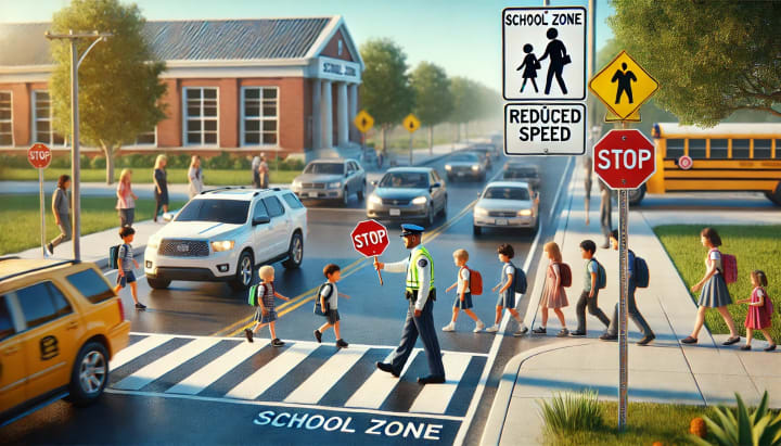 Additionally, crossing guards at school zones often use hand held stop signs to guide traffic. Always stop when a crossing guard signals and proceed only when it’s safe to do so.