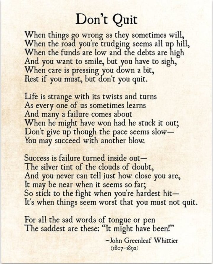 Everyone remembers things about their childhood that stood out as interesting or important. When I was younger I had a lot of moments like that. The first time I traveled outside of the U.S and my first day of middle school. When I first rode a bike, when I learned to swim, and when I went to Las Vegas for a family reunion. The most important parts of me that shaped me became memories I could look back on and smile about. As a kid something I loved was history and I used to live with my aunt. On her door, every day I walked by it I looked at a poem taped on it. That poem is a part of history, of my history, and the history of the person who writes it. It's the most inspirational poem I've ever read. I memorized it and carry it as a memory today. The poem is called "Don't Quit" and some people credit the author Edgar A. Guest as the author but others believe it to be John G. Whittier.