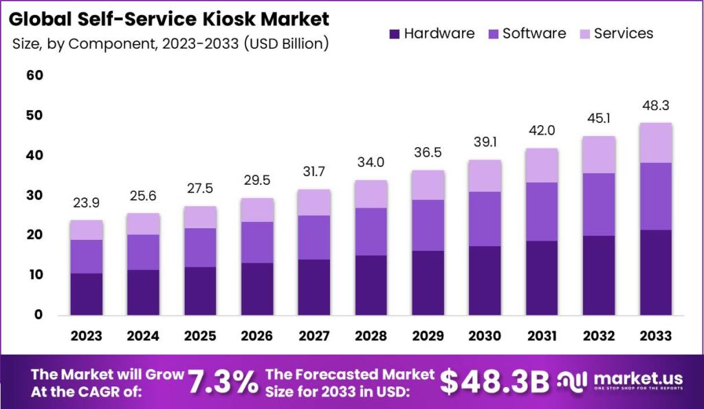 The self-service kiosk market has emerged as a transformative force in retail and service industries, offering convenience and efficiency to both businesses and consumers. Self-service kiosks are interactive terminals that allow users to perform tasks such as ordering food, purchasing tickets, checking in for flights, and accessing information without the need for direct human interaction. As businesses strive to improve customer satisfaction and streamline operations, self-service kiosks have become integral to modern retail and service environments.The global Self-service Kiosk Market is anticipated to be USD 48.3 billion by 2033. It is estimated to record a steady CAGR of 7.3% in the Forecast period 2023 to 2033. It is likely to total USD 23.9 billion in 2023.