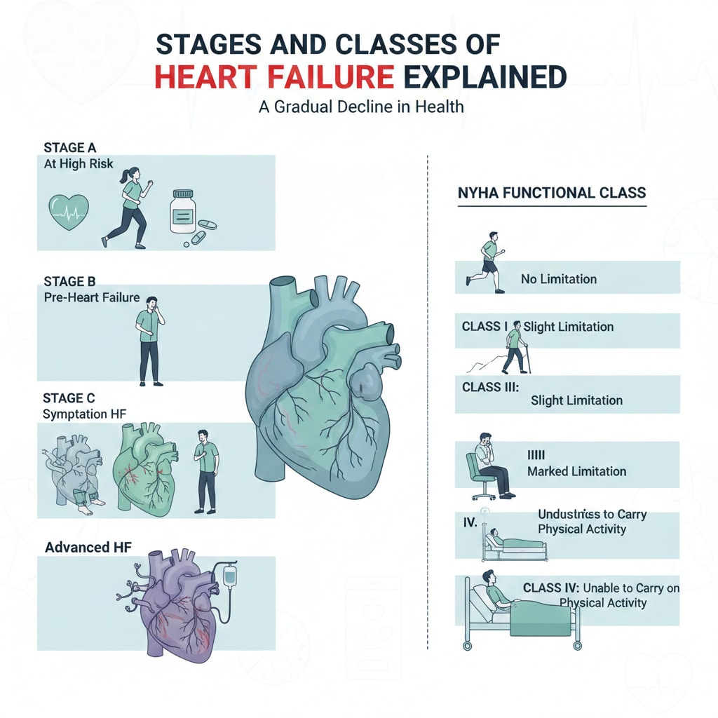 While stages describe disease progression, heart failure classes focus on how symptoms affect daily activity. These are defined by the New York Heart Association (NYHA) and can change over time with treatment.