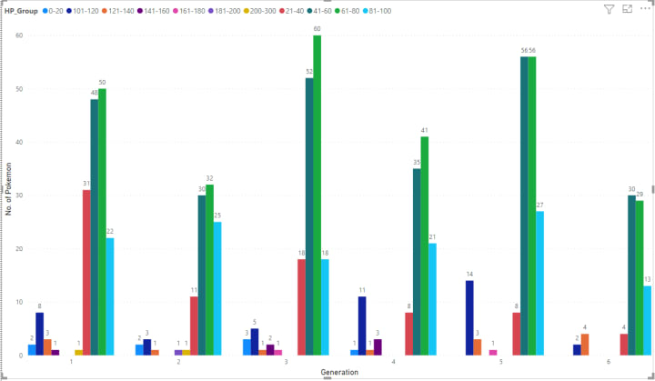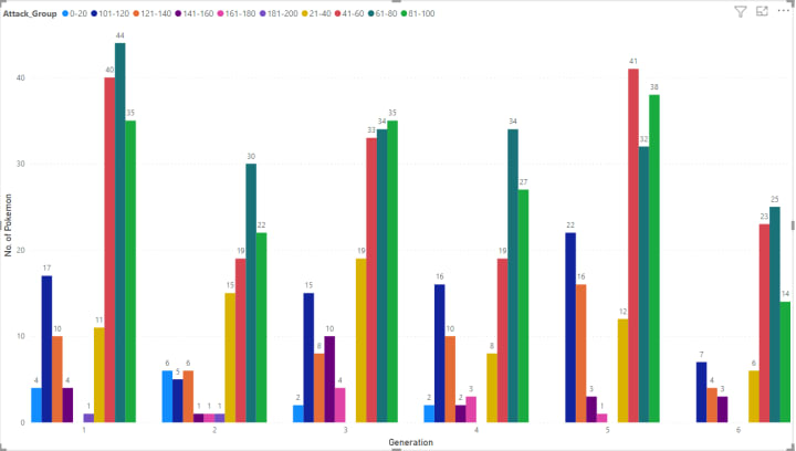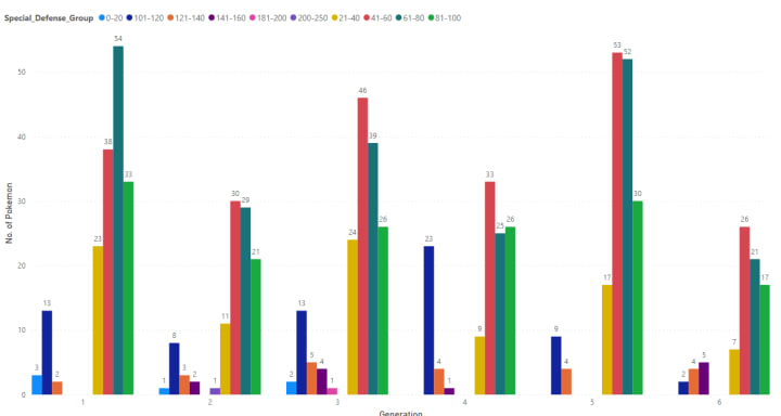 Here we can see Attack group of 0–20 is present for the only Generation 1–4, whereas group 21–40,41–60,61–80 & 81–100 have a fair No. of Pokémon in each Generation.