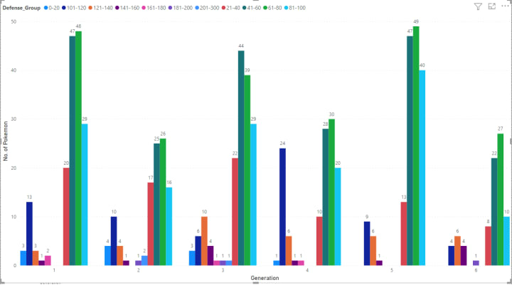 This graph looks similar to the previous graph(Fig 5), as for attack group 0–20 spanned from generation 1 to 4 same is the case here defence group 0–20 is present for the only Generation 1–4. Also, Pokémon with defence between 21–100 are proportionally distributed across each generation.