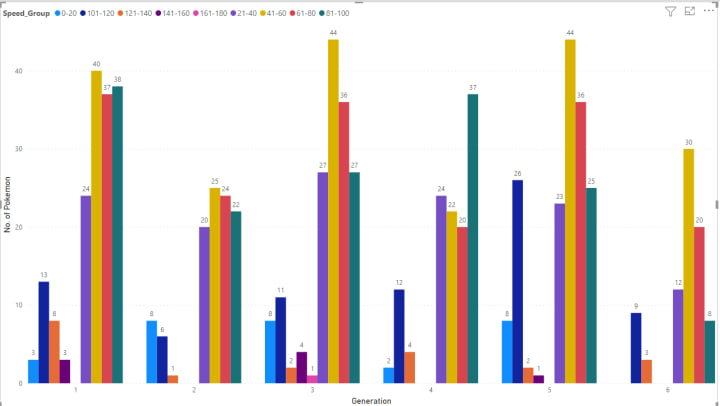 The difference to notice is that top speed is not too high here, the largest group is 161–180 and is present for Generation 3 only and that too only 1 Pokémon.