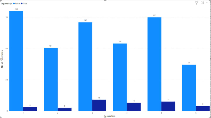 This is a lot simpler graph than the previous graphs… Here we have just 2 bars for each Generation whether the Pokémon is legendary or not...