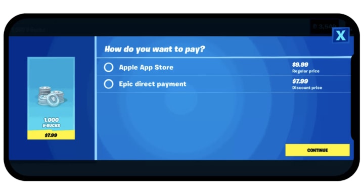 But Epic has never approved of the 30% cut taken by Apple and Google on their respective app stories, so it set up a direct payment system allowing players to buy V-Bucks for cheaper through Epic, circumventing Apple and Google. When buying 1,000 V-Bucks, players were given a choice over paying $9.99 via the App Store or $7.99 through Epic.