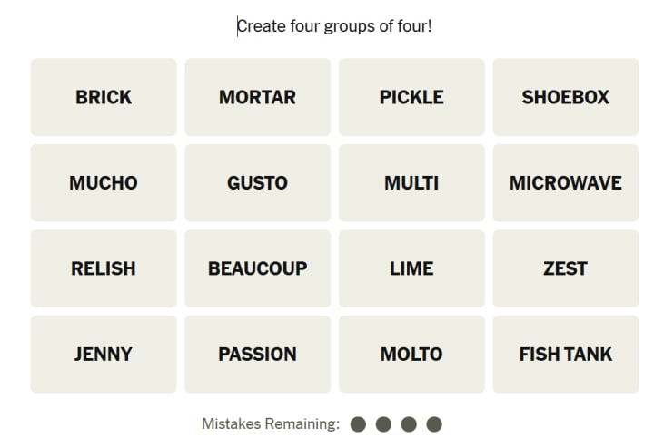 Each puzzle has different levels of difficulty, with some connections being more obvious while others are trickier. Players can make up to four mistakes before the game ends. The goal is to identify all four correct groups.
