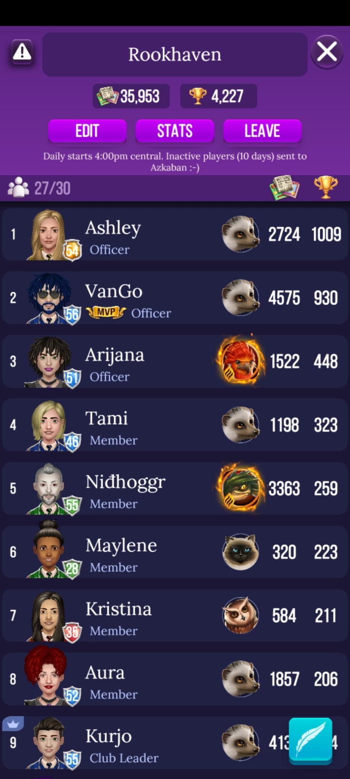 This is my team leaderboard a few days ago. Our team captain is Kurjo and it doesn’t look like he’s doing very well this week. Can you spot him there at the bottom of the list? In ninth place? Well, I guess that’s OK for this time since he’s the best team captain that any team could ever hope to have. He holds the team together, always responding to chats, no matter what. If it wasn’t for him, ROOKHAVEN would have fallen apart long ago and disappeared into the oblivion of Azkaban. Now let’s notice the other members of the team also. These valiant members of the four houses of Hogwarts are the backbone of our success. There’s no doubt in my mind that we’re going to defeat ogres when I see VanGo at the top of the list. Ashley has recently come back from a quiet place (maybe the library?) and has proven her worth as a team member by taking first place. But not for long, I don’t think. She will be overtaken by other team members if she’s not diligent and sneaky to boot. And of course there’s Arijana and Tami and Nidhoggr (I wonder how you pronounce that?) and Maylene, Kristina and Aura.