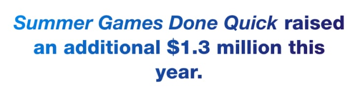 Before their last marathon in July 2016, they had a donation total of just over $2.2 million. Summer Games Done Quick raised that total by adding almost $1.3 million into the donation pot.