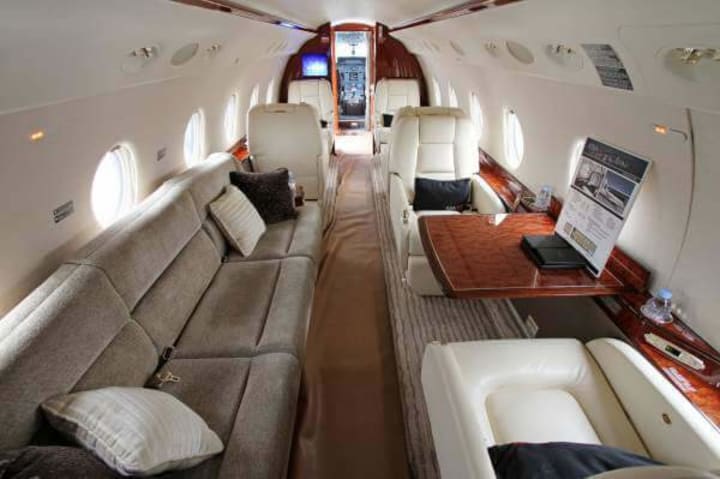 The plane has luxury features that include a 42-inch HD LCD screen, multiple Blu-ray players, satellite TV, theater lighting, and electronically controlled window shades.