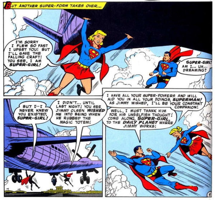 Before she was officially introduced as the cousin to Superman, the name Super-Girl was used in 1958 after Jimmy Olsen discovered a magic totem. Naturally his first wish was for a female version of Superman so that his pal could have someone that could match his 'passion'. At the time Superman was kind of a dick, and wasn't ready to work with another hero so he was fairly emotionless when Super-Girl sacrificed herself to protect him from a Kryptonite meteor. The lethal dose of Kryptonite forced Jimmy to un-wish her.