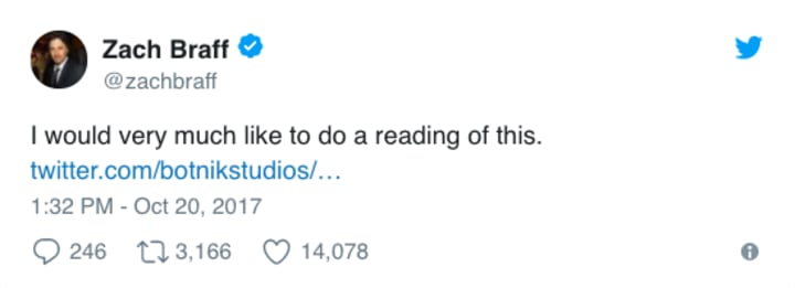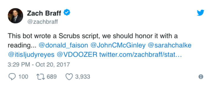 Despite these quirks, it's certainly got people talking including #ZachBraff — Dr John Dorian himself. Braff noticed the tweet from BOTNIK discussing the "average Scrubs script" and immediately made this comment: