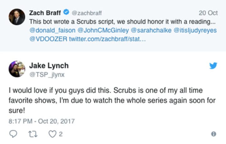 Well, wonder no more, because thanks to the magic of the internet and artificial intelligence, BOTNIK Studios has created a bot that's actually managed to write a wondrously average Scrubs script: