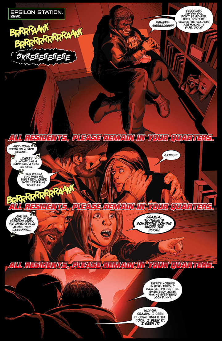 The interiors here are absolutely phenomenal. The linework is exquisitely laid down and how we see the varying weights and techniques being utilised to raise the level and quality of the detail work that we see is astonishingly well utilised. That this is a station and that backgrounds are integral to seeing how small the spaces are manage to increase the way that the depth perception, sense of scale and the overall sense of size and scope make the mood, tone and feel of the book that much more intense. The utilisation of the page layouts and how we see the angles and perspective in the panels show a remarkably talented eye for storytelling. The colour work is brilliantly rendered. How we see the various hues and tones within the colours being utilised to create the shading, highlights and shadow work not to mention how they show aging and weathering inside the corridors shows such an outstanding understanding of how colour can and should work. The creativity and imagination we see throughout is sensational and it shines through in everything we see.