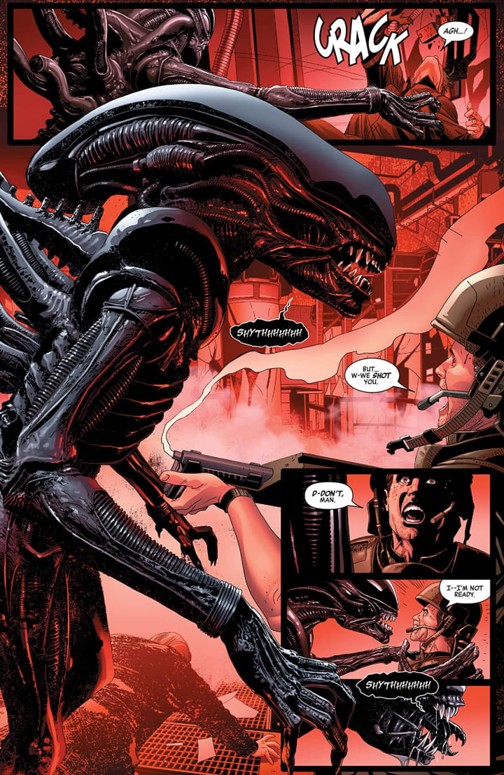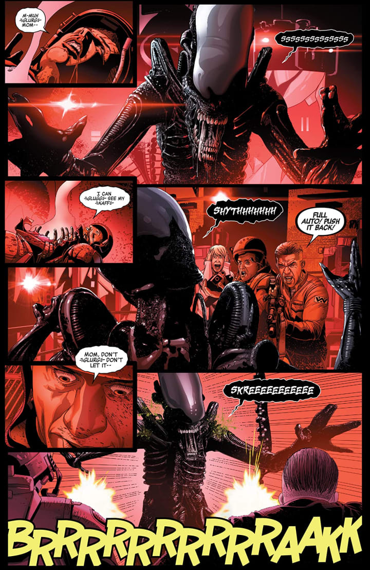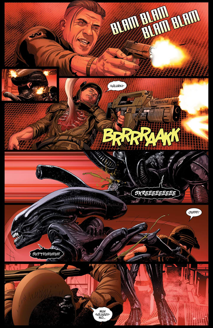 The interiors here are bloody gorgeous! The linework is exquisite and how we see the varying weights and techniques we see being utilised to create this level of quality in the detail work is truly astounding. You know you are in for this visually stunning experience just by opening the book to the first page. I would like to see backgrounds utilised more effectively, they are on a space station and the corridors aren’t as wide as we see them so I’d love to see that cramped quarters feeling to really add that claustrophobic feel to what we see as the Xenomorphs rush towards them. The utilisation of the page layouts and how we see the angles and perspective in the panels show a brilliant eye for storytelling. The colour work is absolutely stunning. How we see the various hues and tones within the colours being utilised to create the shading, highlights and shadow work shows such a mastery for colour. The way the red lights cast their glow and alter the shading is brilliantly done. The black is shiny and creepy like weather leather in all the right places. That shot of the Xenomorph coming out of Mitch oh mummy is that a moment.