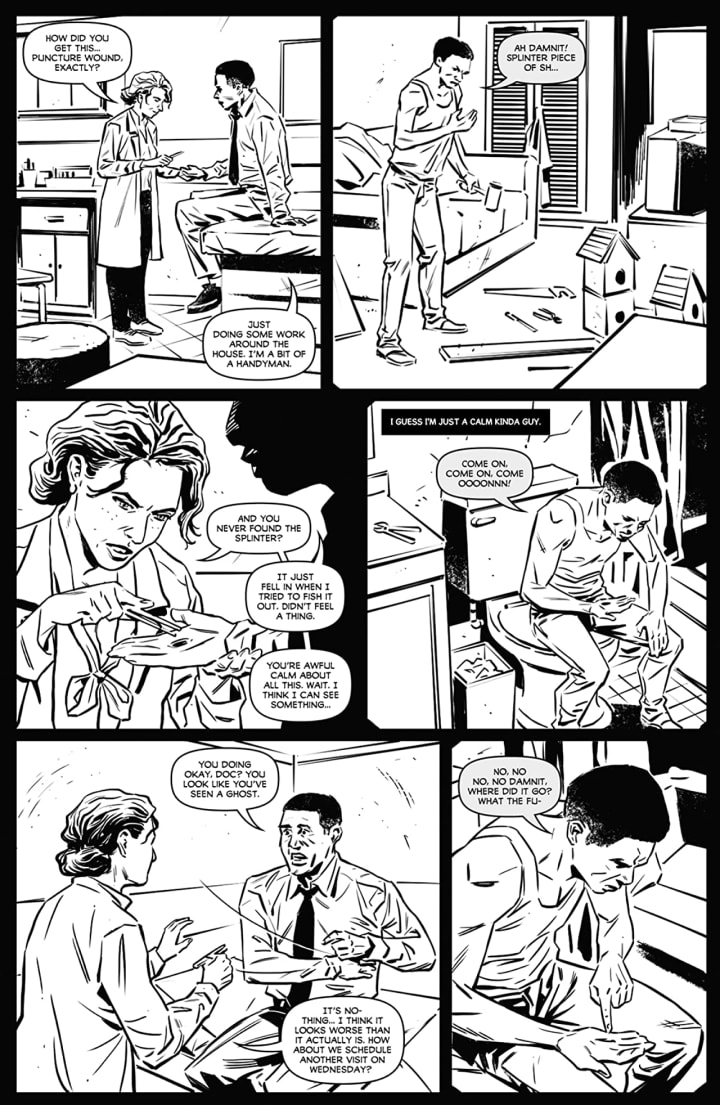 Now I’m all for a Noir Detective story that somehow features the supernatural, or monsters considering when these stories generally take place. The slotted window frames are a dead giveaway, please pun was definitely intended, for the genre. I kind of like the idea of Calvin Jones and who and what he represents here. It is a bit surprising but once you get it and you can’t forget it suddenly so much more makes sense and the small intense journey is pretty amazing.
