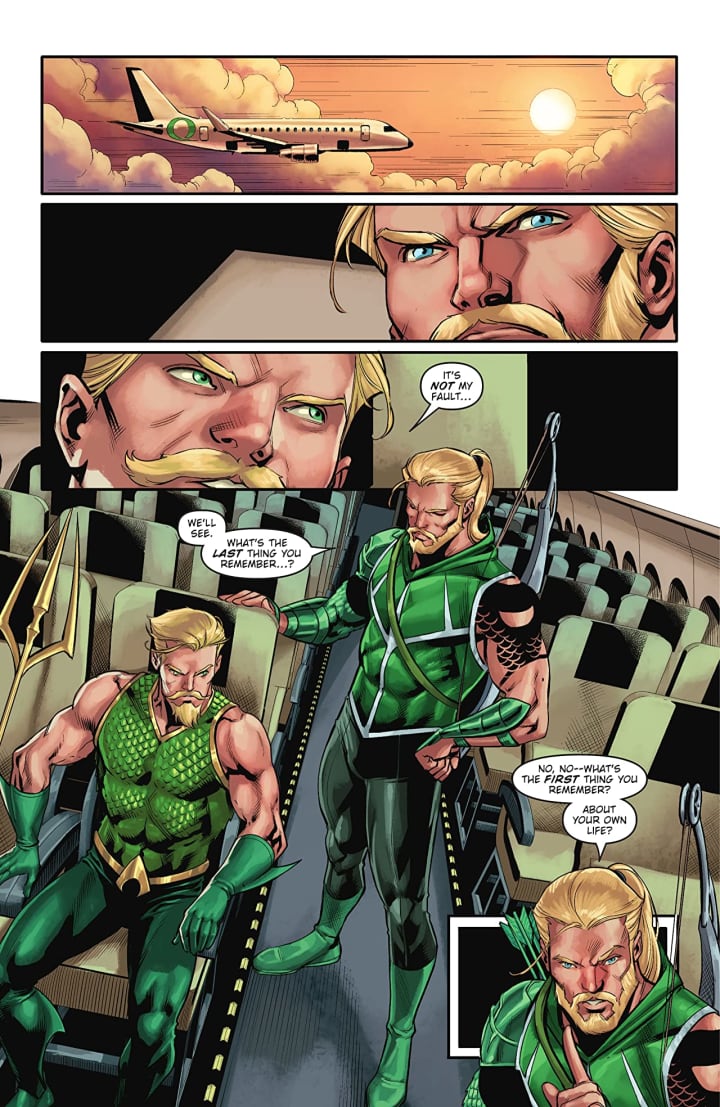 There really is this whole idea of these two particular heroes teaming up that is incredibly appealing. I mean out of all the incarnations of the League that I’ve lived through they never really did team-up and while they both have sidekicks that worked together and are friends they never really did much together. Now Arthur’s snooty attitude towards Oliver as if he’s a lesser being than he is really rather off putting. Though I suspect by the end of this there will be a new begrudging respect for him. Okay at least I hope this is the case. I am so engaged in this I’m not even in the story yet just comparing the two and going off page. This should say something about the story Brandon is weaving here. If you think about aside from the sidekicks the only thing they have in common is they are both blondes. I wonder how much of a factor these elements played in mind swapping the two for this tale.