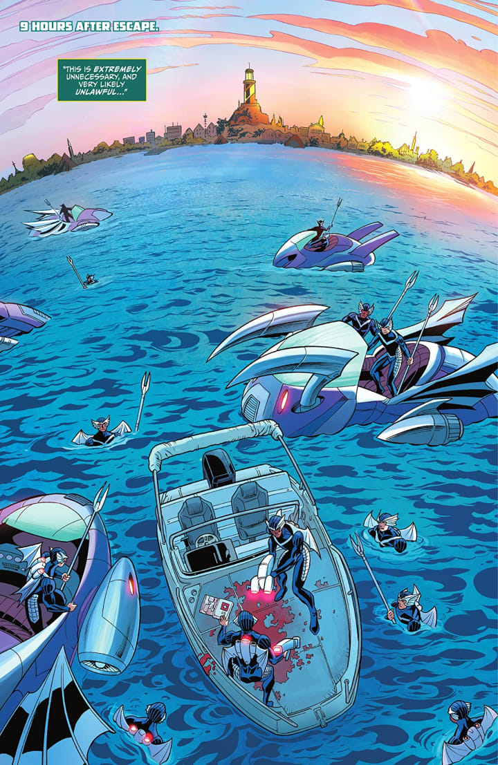 Well to be honest I’m not sure how this story is going to take him from Aqualad to Aquaman but I’ll go with it. Though I do wonder where Garth is in all this and why he’s not helping Jackson? Regardless, I’m enjoying seeing Jackson forced to come into his own, on his own thus far as it really shows us the kids mettle. With the Atlantean army hot on his heels and Deluge after him, can Jackson find someplace to catch his breath and recuperate long enough to figure out what is going on? Nope, this is comics after all and part of being a great hero is learning to think on your feet and figure things out in the moment. Plus why were they so keen to kidnap Jackson’s mother, what role does she play in all this.