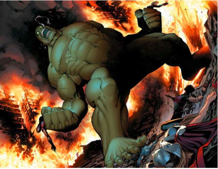 That arc led to a head-to-head, one-on-one battle between the Hulk and the Sentry. As part of that fight, the Hulk's rage built to the point where a single stamp of his foot caused earthquakes across the whole Eastern Seaboard. We were told that one more stamp on that scale would have literally sent the East Coast into the sea. That's how out-of-control he was at that point.