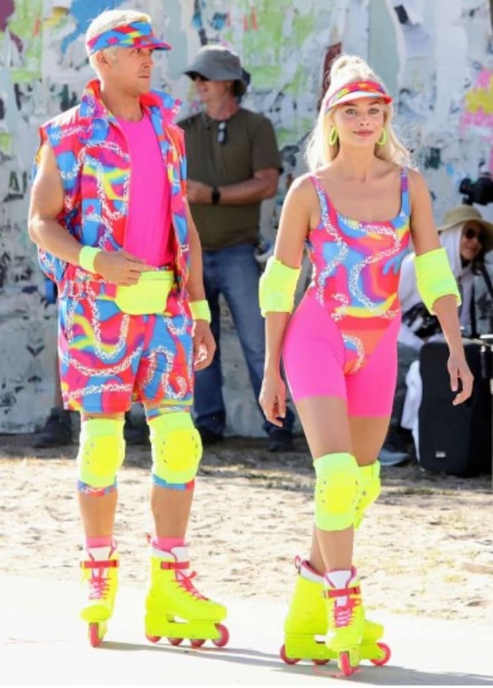 This above behind-the-scenes photo shows Robbie and Gosling inline skating in matching neon outfits from their upcoming movie.
