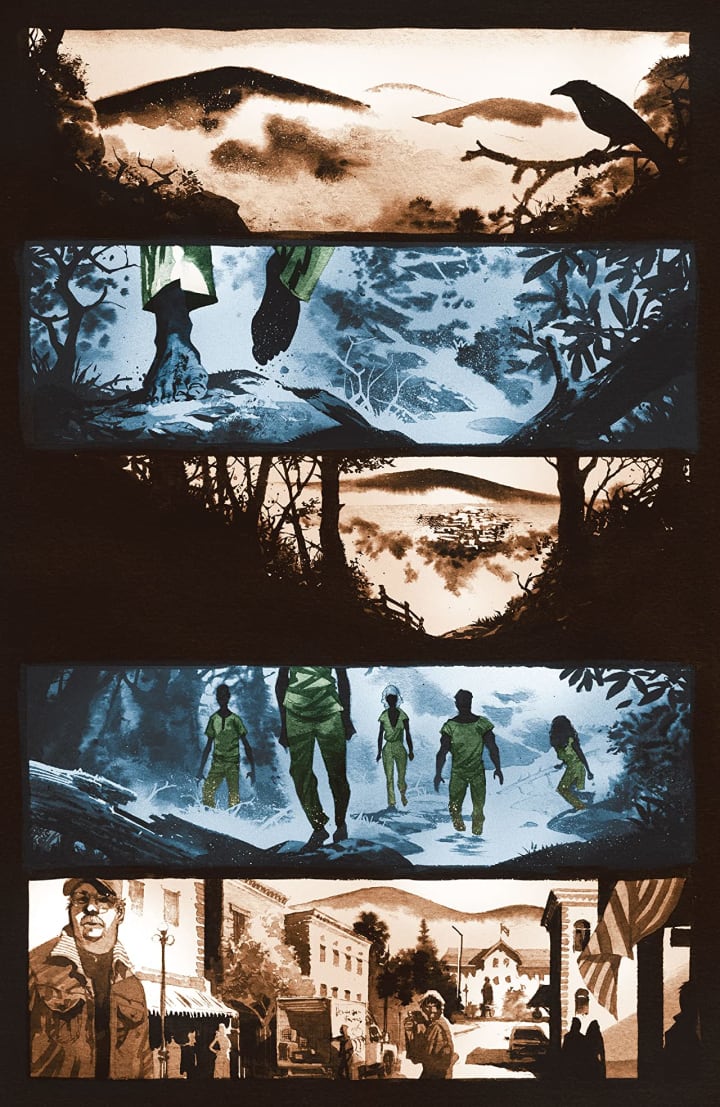 I like the interiors here. I was really impressed with how we see the opening visually and was hoping that we’d see that throughout. The main story is tad toned down but still rather impressive to see. The linework is beautifully rendered and how we see the varying weights and techniques being utilised to create the detail work is phenomenal to see. I do wish we’d see backgrounds being utilised throughout as they enhance the moments perfectly. Still how we see the composition within the panels bring us some great depth perception, sense of scale and that overall sense of size and scope to the book. The utilisation of the page layouts and how we see the angles and perspective in the panels show a remarkably talented eye for storytelling. The colour work is phenomenal. The various hues and tones within the colours being utilised to create the shading, highlights and shadow work is amazingly well rendered.