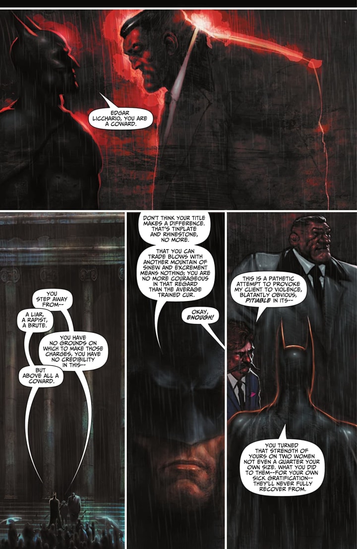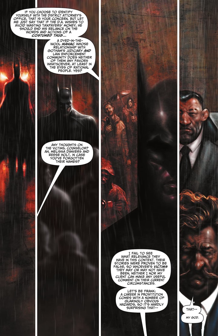 The interiors here are bloody gorgeous! How we see the linework being utilised and through its varying weights and techniques to create this amazing detail work is really extraordinary to see. There is some excellent usage of backgrounds here too and they enhance the moments while also bringing us depth perception, a sense of scale and the overall sense of size and scope to the story. The utilisation of the page layouts and how we see the angles and perspective in the panels show such a masterful eye for storytelling. Now its the colour work that makes this book what it is. The painting is glorious and how we see the various hues and tones within the colours being utilised to create the shading, highlights and shadow work show such a mastery of skill and talent. The overall feel is so archetype Batman and yet its amped to a level that really makes it even more dark and creepy befitting this story.