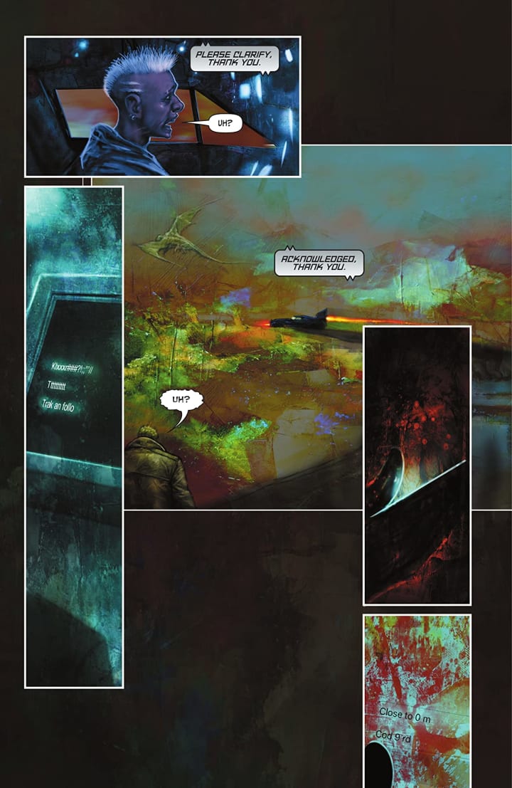 The interiors here are mindbogglingly brilliant to see. They really do leave you gobsmacked at just how they make you feel. The mood, tone and feel of every given moment shines through on the page beautifully. The linework we see and how this brings about the attention to detail is sensationally rendered. The composition within the panels brings out the depth perception, sense of scale and the overall sense of size and scope to the story wonderfully. The utilisation of the page layouts and how we see the angles and perspective in the panels show a masterful eye for storytelling. The various hues and tones within the colours being utilised to create the shading, highlights and shadow work show such a master colourists eye at work.