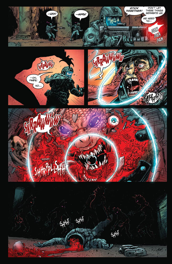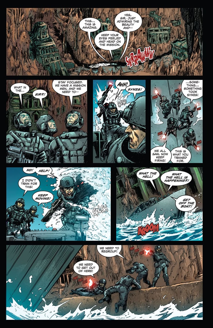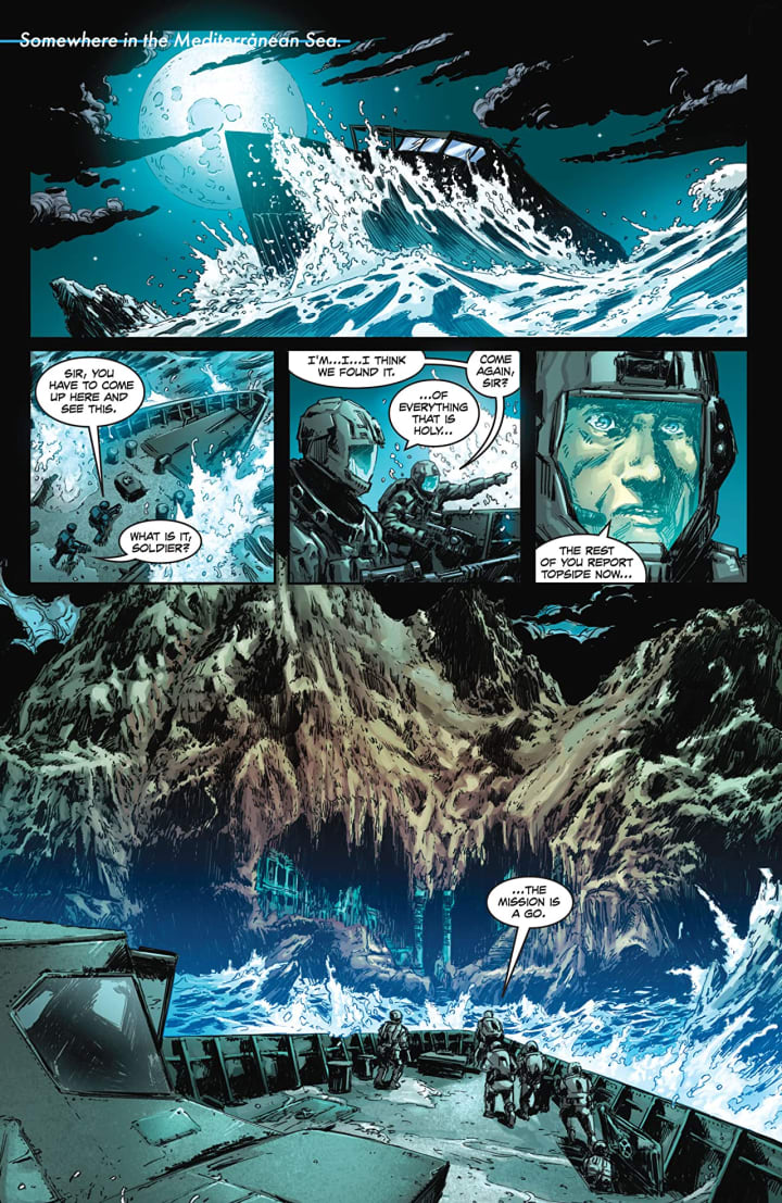 The interiors here are mindbogglingly brilliant. The linework is exquisite and how we see the varying weights and techniques being utilised to create this level and quality to the detail work is astonishingly well rendered. The views are bloody brilliant and thanks to how we see the backgrounds marks this more impressive and how they work within the composition of the panels to bring us this depth perception, sense of scale and the overall sense of size and scope to the book is marvellous. The utilisation of the page layouts and how we see the angles and perspective in the panels show a marvellous eye for storytelling. The colour work is utterly brilliant as well. How we see the various hues and tones within the colours being utilised to create the shading, highlights and shadow work show a mastery of colour and how to get the maximum effect out of it.