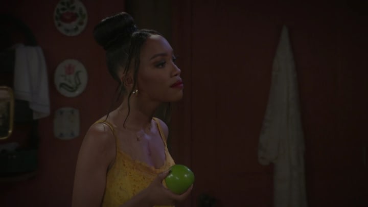 This capture is from the August 26 episode, but honestly, I just wanted to show it because of Allison holding the apple. The whole thing with Allison holding Chelsea hostage like this is similar to a lot of fairy tales with unhinged villainesses. Rapunzel definitely comes to mind, and here's how in the dark I was regarding that story: it took Disney releasing Tangled for me to finally learn that Rapunzel featured a villainess. And of course, Allison holding an apple is giving off clear Wicked Queen vibes, especially since Chelsea suspects it may be poisoned.